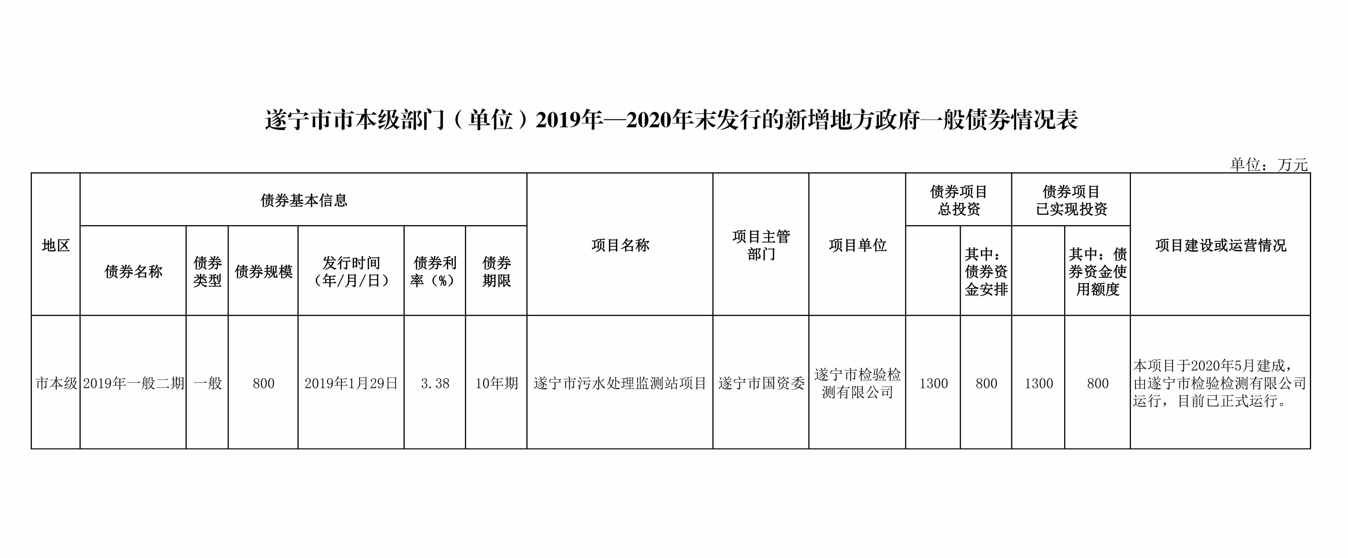 ? ? 根據(jù)財政廳關(guān)于印發(fā)《四川省政府債務(wù)信息公開實施細則(試行)的通知》(川財債〔2019〕9號)文件要求,現(xiàn)將我單位2019年—2020年度存續(xù)期內(nèi)地方政府新增債券資金使用、項目建設(shè)進度、運營情況公開如下。